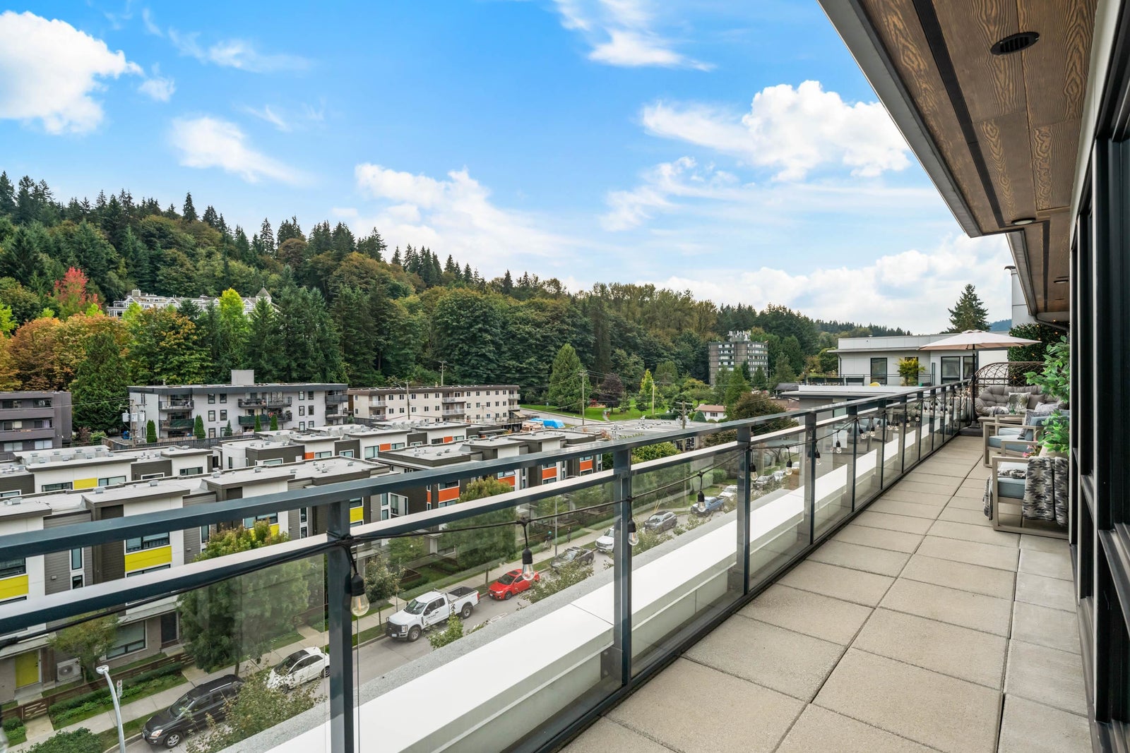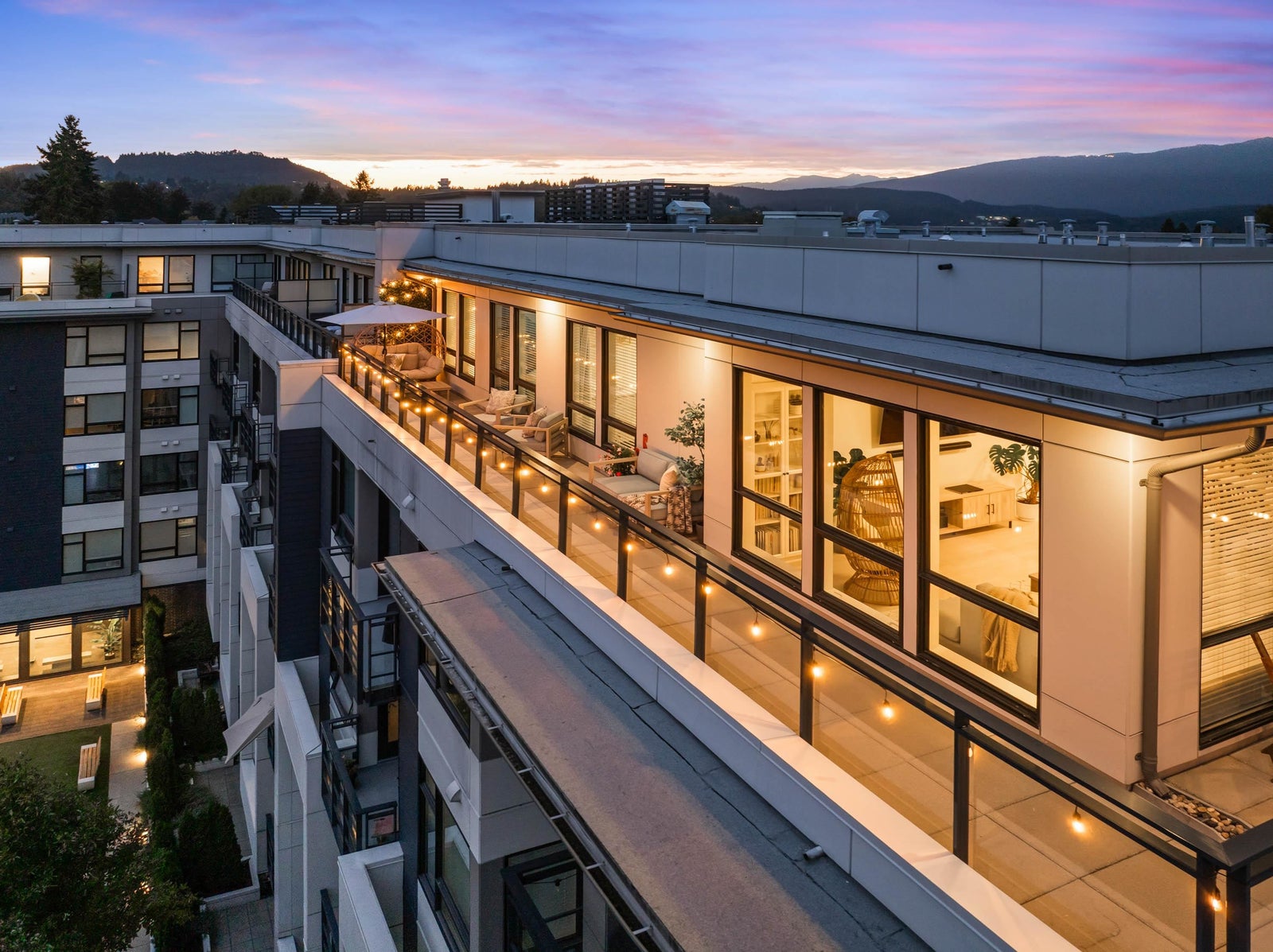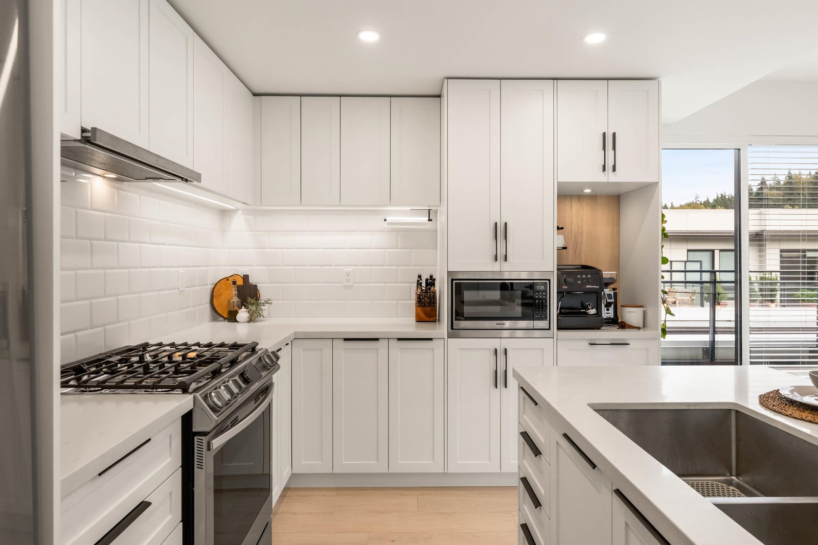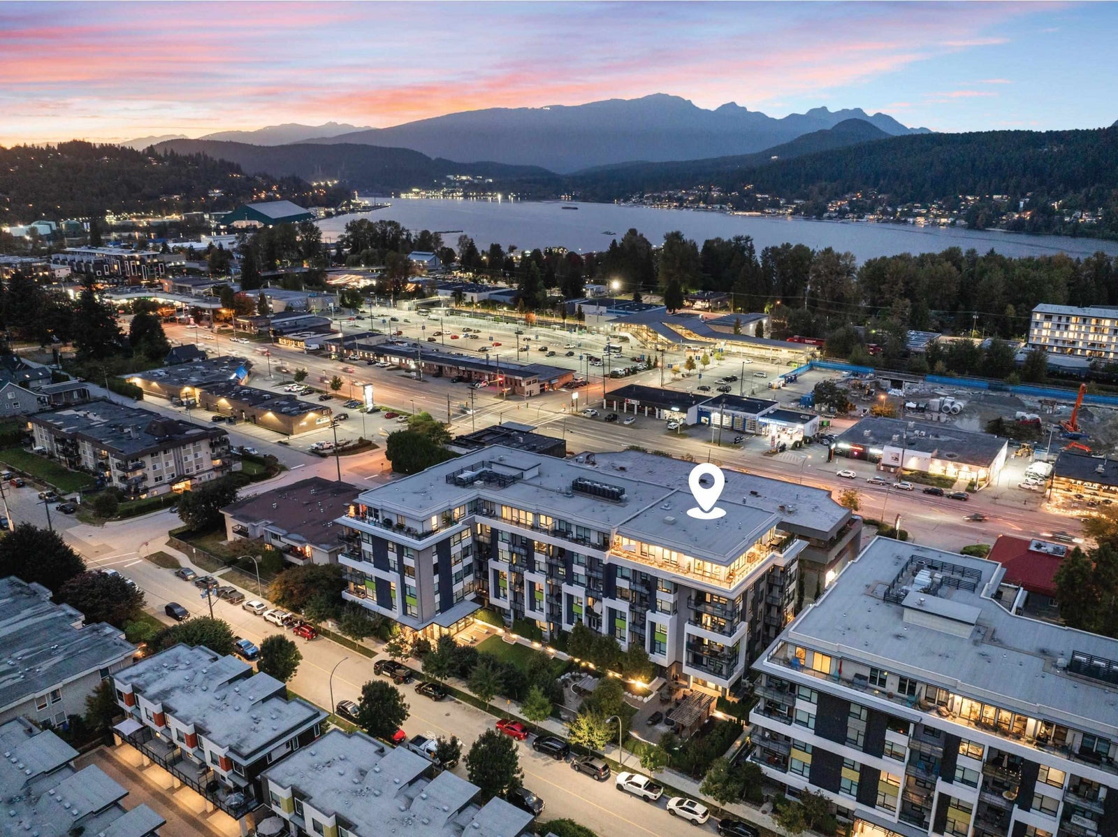 Absolutely stunning, RARE 3 Bed/2 Bath CORNER PENTHOUSE built by award winning Marcon. Over 1800 sq/ft of incredible indoor/outdoor living space! Huge wrap around balcony w/sunny southeast views perfect for morning coffee or afternoon relaxation! So many upgrades inc gourmet kitchen w/quartz countertops & large island, S/S appliances inc gas stove, side by side full laundry, gorgeous upgraded luxury laminate flooring, BONUS Air conditioning, plus custom built in closets throughout. Enjoy two side by side parking stalls w/huge private concrete locker (in front of parking) An exceptional location just steps to Inlet Centre Stn, famous Rocky Point Park, Brewers Row, top schools & the trendy shops at both Newport & Suterbrook Village. A RARE FIND! See full video tour. Open house Nov 16, 1-3