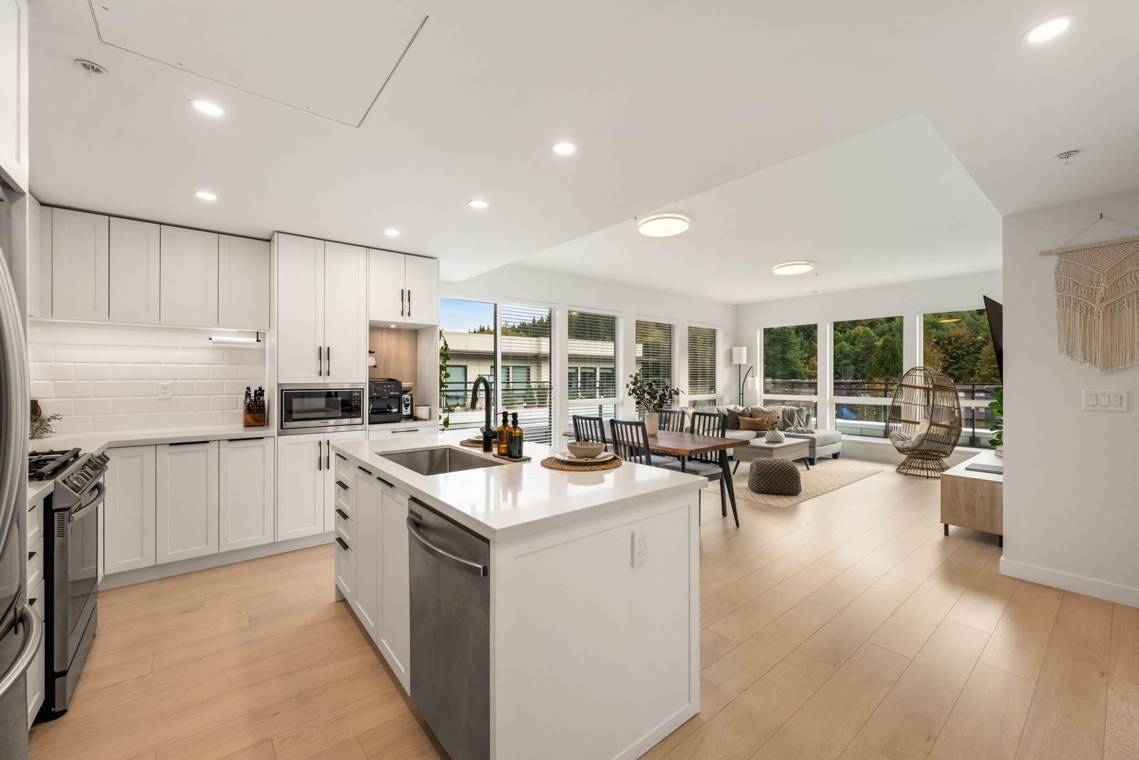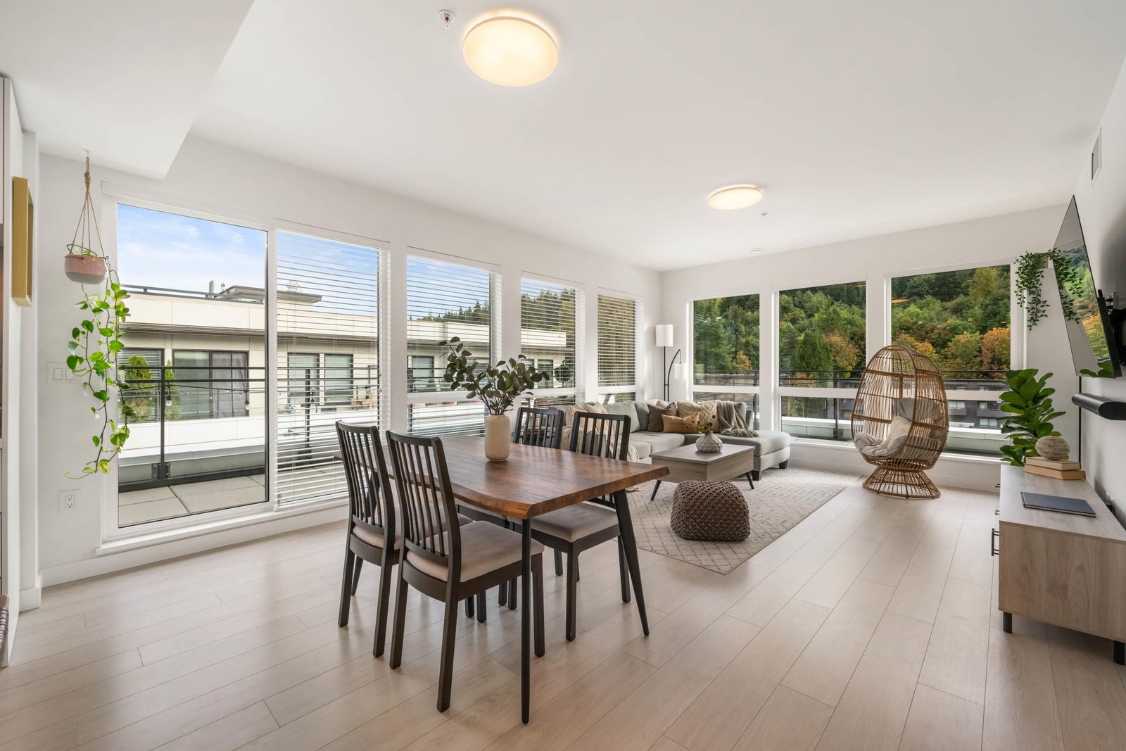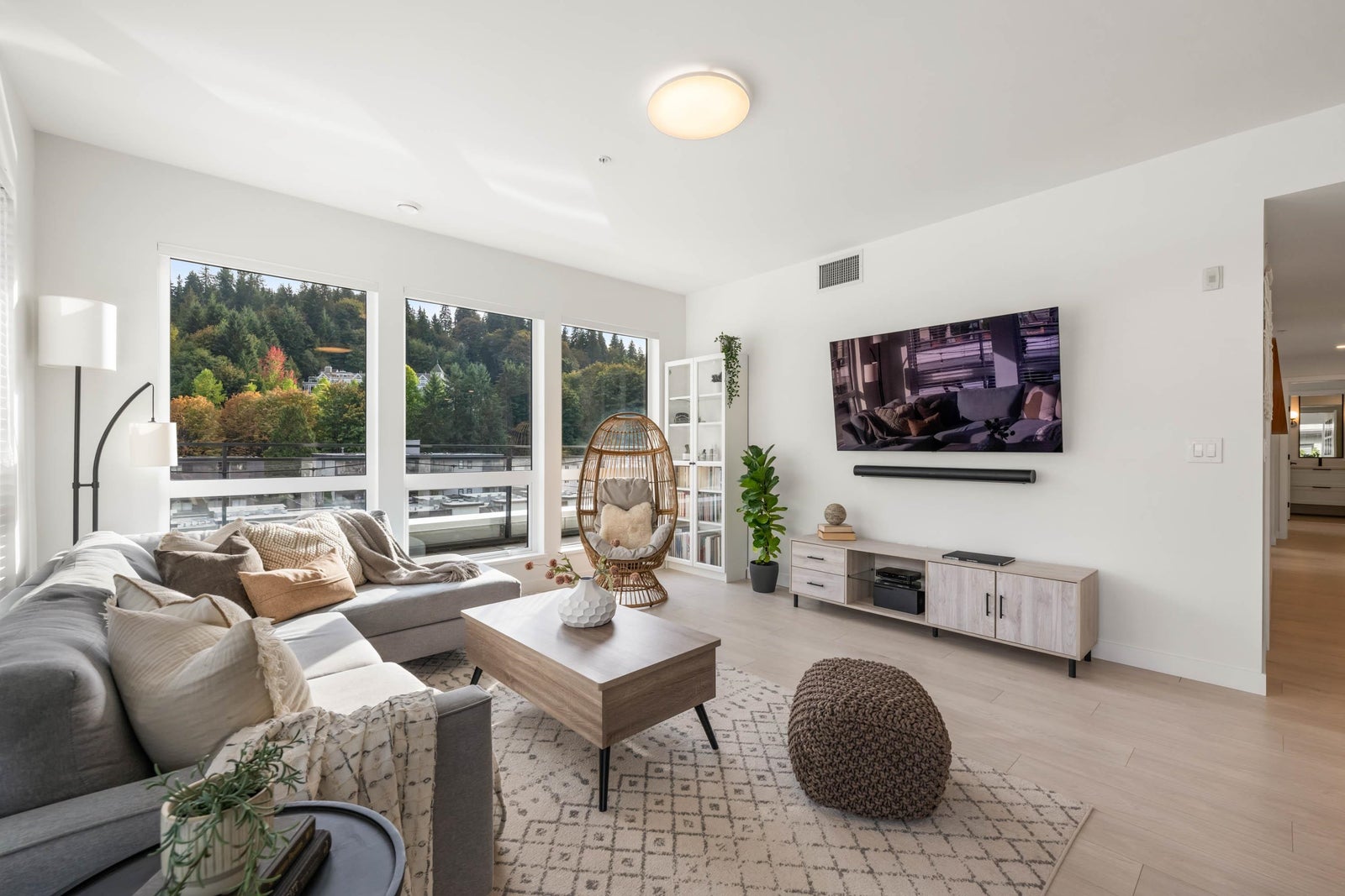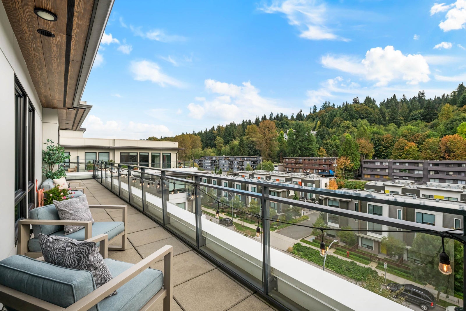 Absolutely stunning, RARE 3 Bed/2 Bath CORNER PENTHOUSE built by award winning Marcon. Over 1800 sq/ft of incredible indoor/outdoor living space! Huge wrap around balcony w/sunny southeast views perfect for morning coffee or afternoon relaxation! So many upgrades inc gourmet kitchen w/quartz countertops & large island, S/S appliances inc gas stove, side by side full laundry, gorgeous upgraded luxury laminate flooring, BONUS Air conditioning, plus custom built in closets throughout. Enjoy two side by side parking stalls w/huge private concrete locker (in front of parking) An exceptional location just steps to Inlet Centre Stn, famous Rocky Point Park, Brewers Row, top schools & the trendy shops at both Newport & Suterbrook Village. A RARE FIND! See full video tour. Open house Nov 16, 1-3