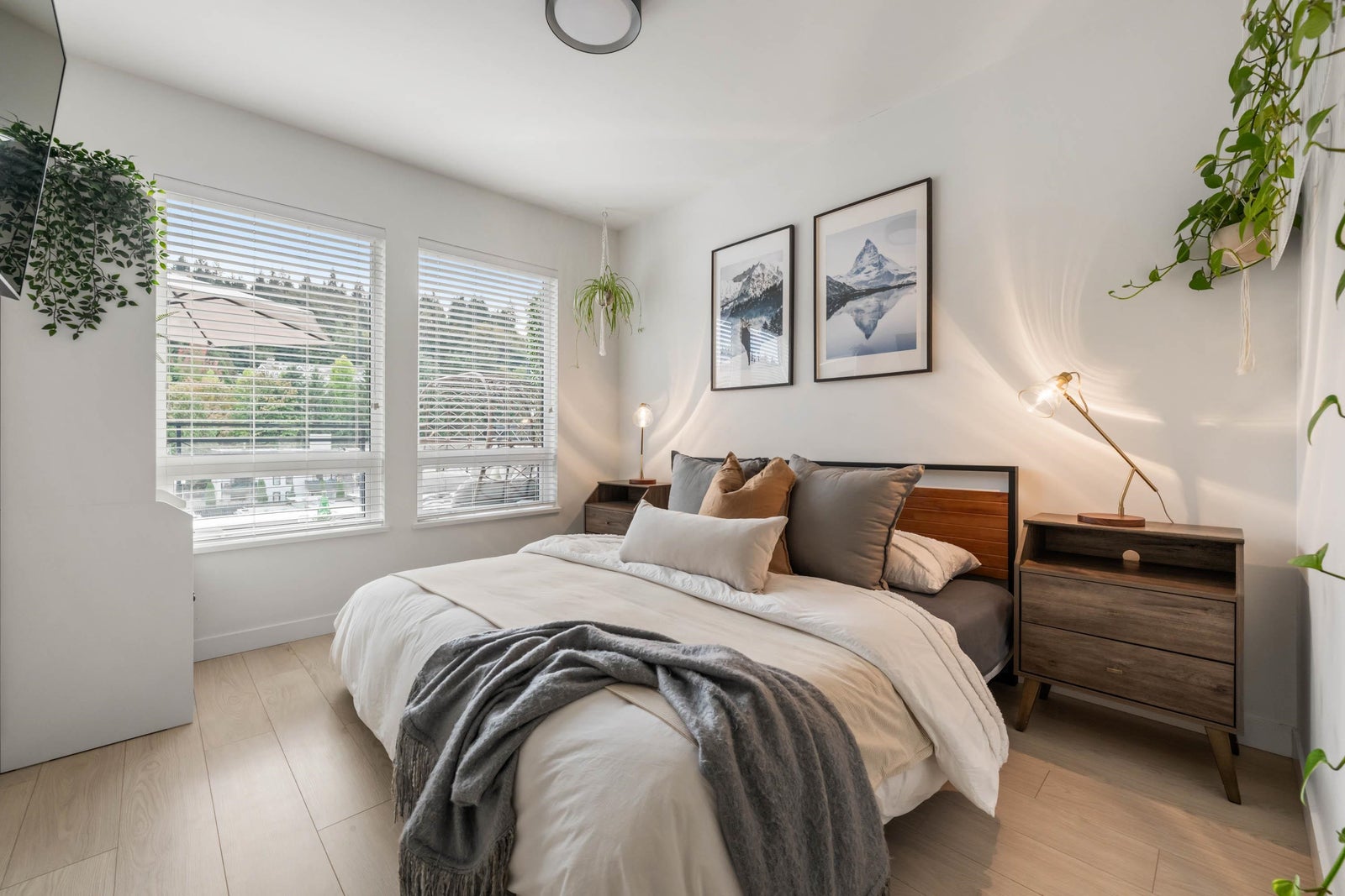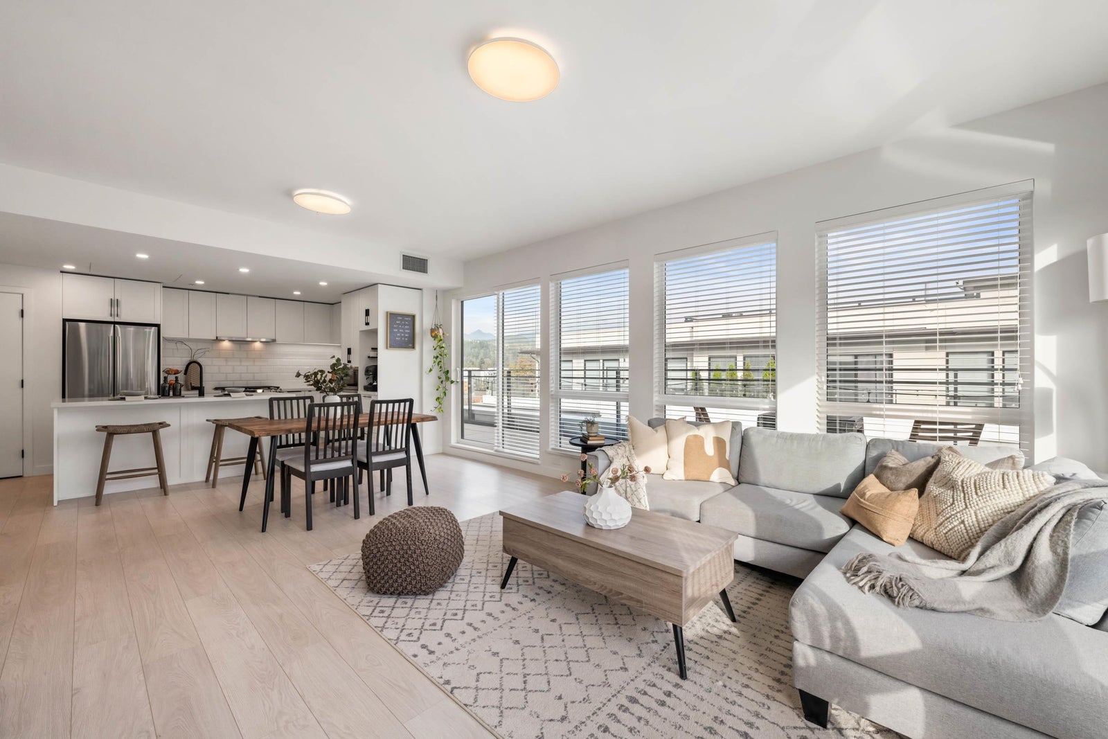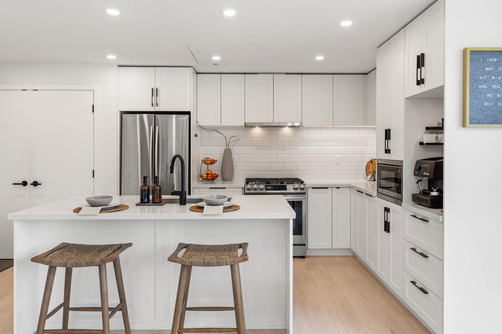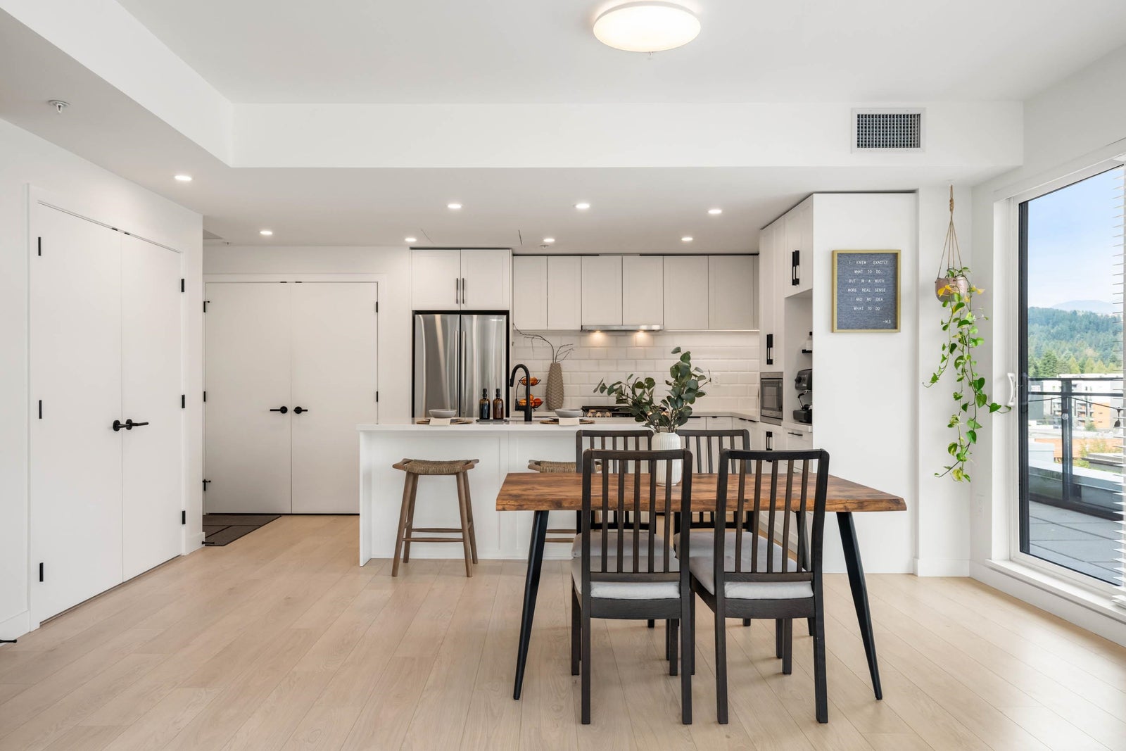 Absolutely stunning, RARE 3 Bed/2 Bath CORNER PENTHOUSE built by award winning Marcon. Over 1800 sq/ft of incredible indoor/outdoor living space! Huge wrap around balcony w/sunny southeast views perfect for morning coffee or afternoon relaxation! So many upgrades inc gourmet kitchen w/quartz countertops & large island, S/S appliances inc gas stove, side by side full laundry, gorgeous upgraded luxury laminate flooring, BONUS Air conditioning, plus custom built in closets throughout. Enjoy two side by side parking stalls w/huge private concrete locker (in front of parking) An exceptional location just steps to Inlet Centre Stn, famous Rocky Point Park, Brewers Row, top schools & the trendy shops at both Newport & Suterbrook Village. A RARE FIND! See full video tour. Open house Nov 16, 1-3