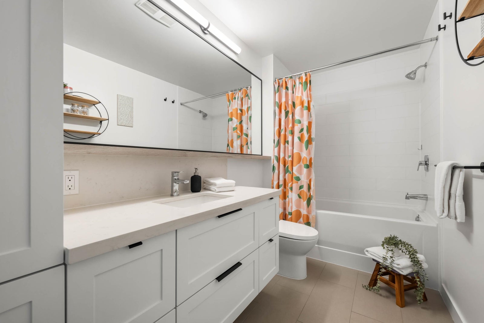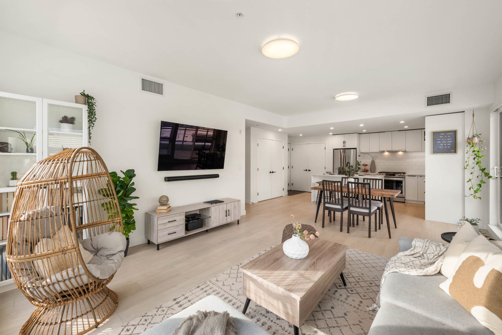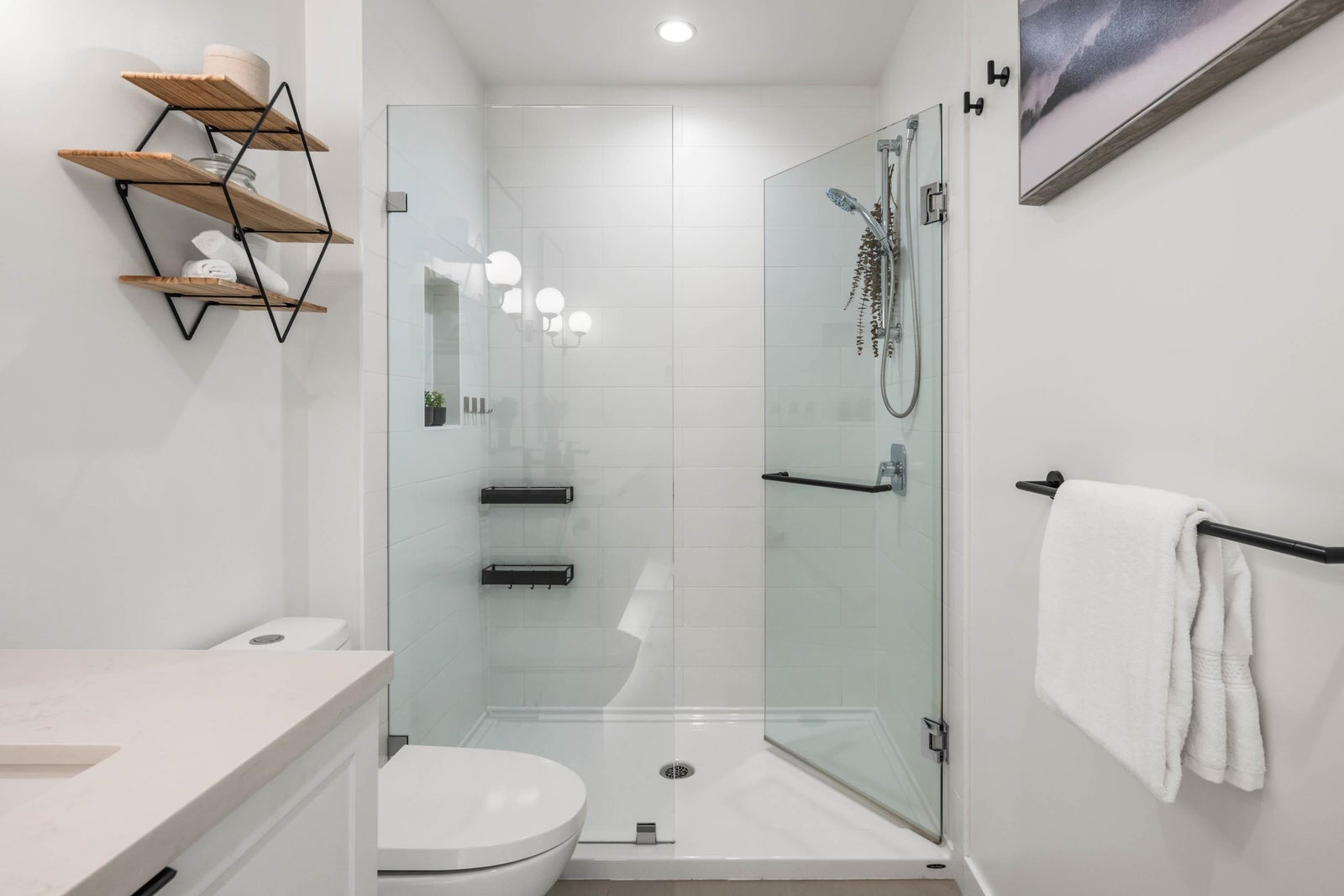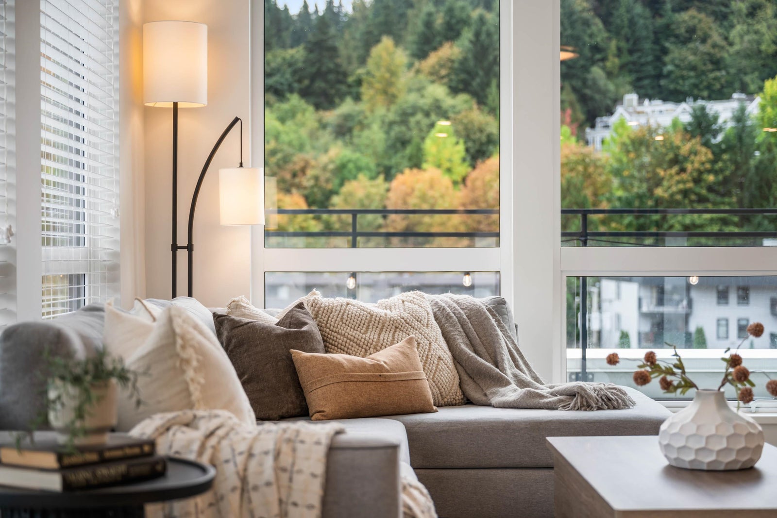Absolutely stunning, RARE 3 Bed/2 Bath CORNER PENTHOUSE built by award winning Marcon. Over 1800 sq/ft of incredible indoor/outdoor living space! Huge wrap around balcony w/sunny southeast views perfect for morning coffee or afternoon relaxation! So many upgrades inc gourmet kitchen w/quartz countertops & large island, S/S appliances inc gas stove, side by side full laundry, gorgeous upgraded luxury laminate flooring, BONUS Air conditioning, plus custom built in closets throughout. Enjoy two side by side parking stalls w/huge private concrete locker (in front of parking) An exceptional location just steps to Inlet Centre Stn, famous Rocky Point Park, Brewers Row, top schools & the trendy shops at both Newport & Suterbrook Village. A RARE FIND! See full video tour. Open house Nov 16, 1-3
